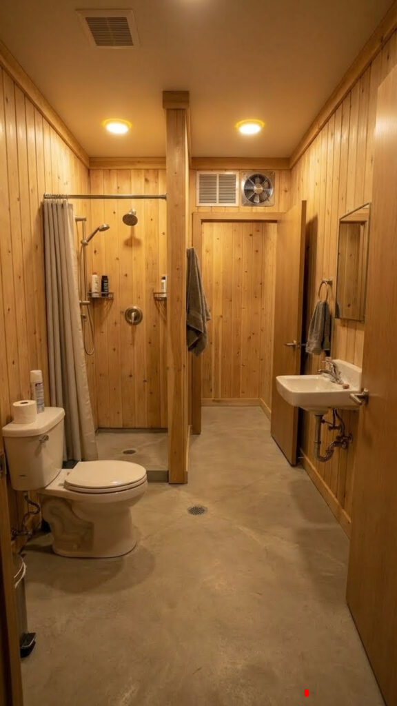 The shower features a durable stone-lined enclosure with a water-saving system connected to filtered water storage. Hot water is supplied through an efficient heating system, ensuring consistent pressure and temperature while minimizing energy consumption. Proper ventilation prevents moisture buildup and maintains air quality.