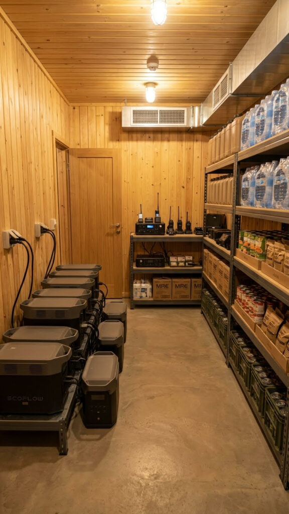 Efficient LED lighting, forced-air ventilation, and insulated wood paneling keep the room dry, temperature-stable, and comfortable to work in. Together, this storage and battery room forms the heart of the shelter’s autonomy infrastructure—supplying energy, food, water, and operational control when self-sufficiency matters most.