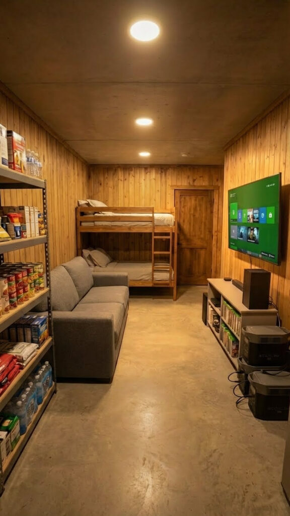 The layout is optimized for survival and comfort. Built-in shelving holds long-term food supplies, water, and essentials, all organized for quick access. A bunk bed provides sleeping space for two adults, while a compact sofa adds a daytime living area. The entertainment and communication zone includes a TV, media storage, and equipment that can be connected to satellite or local communication systems, helping maintain contact with the outside world if needed.