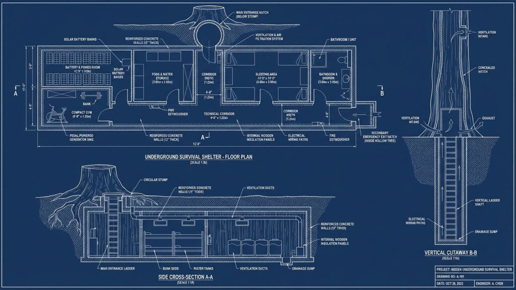Inside, the shelter is built for resilience and practicality. Thick reinforced walls provide protection from external threats and temperature extremes, while the interior is insulated and finished with natural wood to maintain a stable, comfortable microclimate year-round. The compact layout can house sleeping quarters, storage for food and water, communication equipment, and independent power systems. Ventilation and air filtration are discreetly integrated to ensure fresh airflow without revealing the shelter’s location.