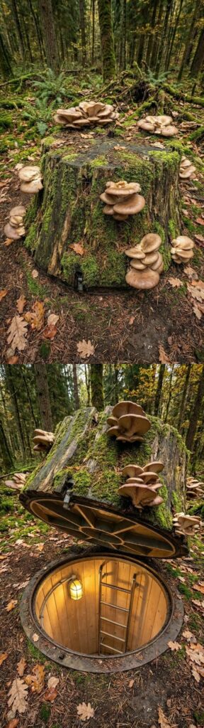 Disguised as a natural forest stump and covered with moss and wild mushrooms, this underground shelter is virtually invisible from the surface. At first glance it blends perfectly into the surrounding woodland, but beneath the camouflaged stone-and-wood hatch lies a secure, well-engineered bunker designed for privacy, safety, and long-term autonomy. The entrance opens silently to reveal a reinforced circular shaft with a solid steel ladder, warm wooden lining, and protected lighting, allowing safe access even in harsh weather or low visibility.
