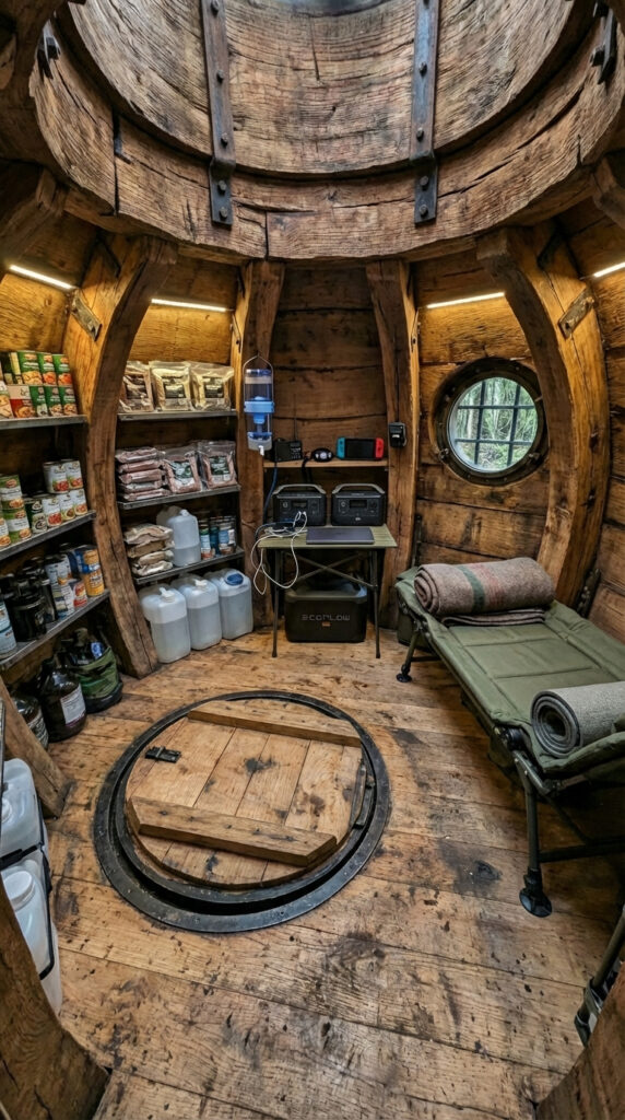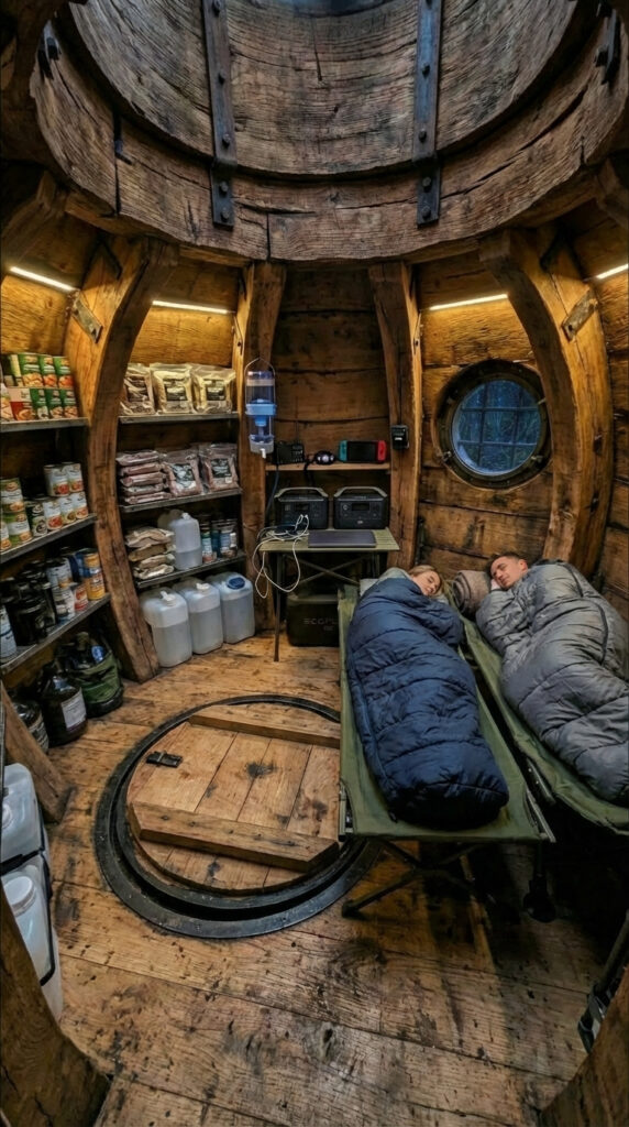 Surrounded by stored supplies, independent power systems, and filtered water reserves, the interior provides a sense of long-term security and self-sufficiency. The thick wooden structure and concealed design isolate the space from the outside world, offering silence, warmth, and psychological comfort even during extended stays.