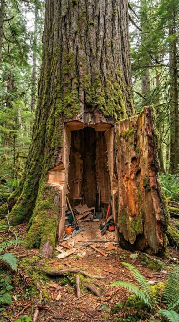 First, the inner core of the trunk is carefully hollowed, leaving the external bark and shape untouched. This approach ensures the tree remains visually intact while creating enough internal volume for a compact shelter.