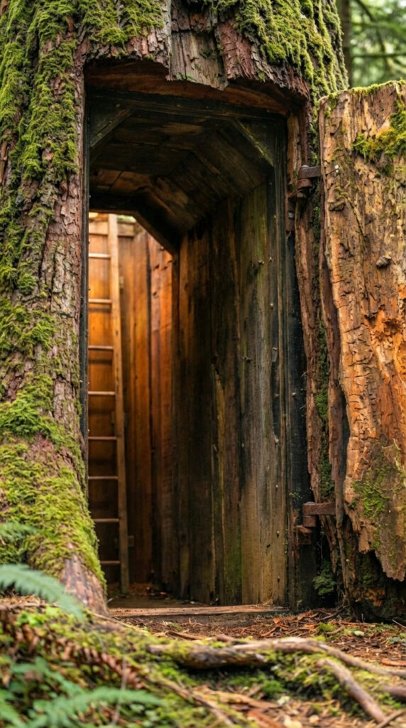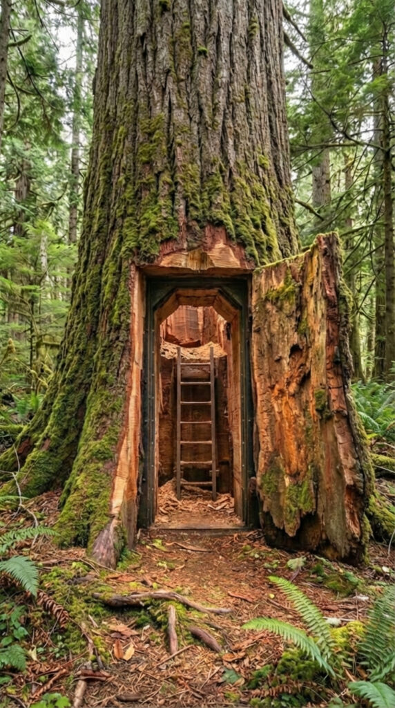 Hidden inside the trunk of a massive 500-year-old tree, this concealed shelter is designed to be completely invisible from the outside. At first glance, it looks like an untouched part of the ancient forest, covered in moss, bark, and time itself. A discreet doorway carved into the natural structure of the tree reveals a narrow entrance that leads downward into a protected underground space.