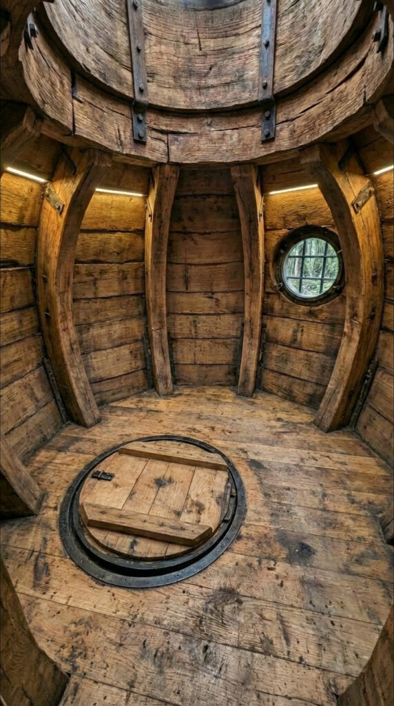 At the center of the floor is a circular concealed hatch. When closed, it blends seamlessly into the wooden flooring, remaining almost invisible. Once opened, the hatch reveals a compact vertical shaft with a ladder, providing access to the lower level of the shelter. This design minimizes surface visibility and maximizes concealment.