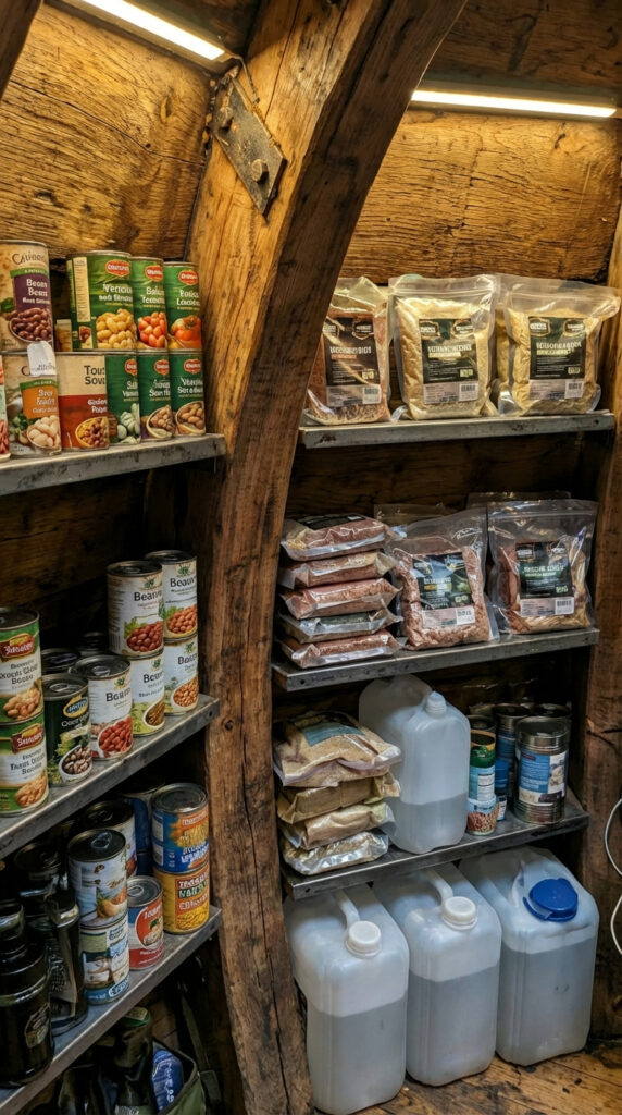 Long-term food and water supplies are organized on reinforced shelves built directly into the wooden structure. The storage system includes canned goods, vacuum-sealed dry foods, grains, and emergency rations designed for extended shelf life. Multiple water containers provide a reliable reserve, while a gravity-based filtration system allows safe drinking water preparation if resupply is not available.