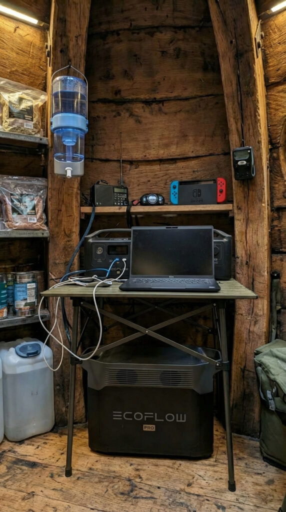 Inside the tree shelter, a compact off-grid power and supply system ensures autonomous operation during emergency or temporary isolation. Electricity is provided by a portable EcoFlow power station, capable of running essential devices such as lighting, communication equipment, laptops, radios, and water filtration systems.