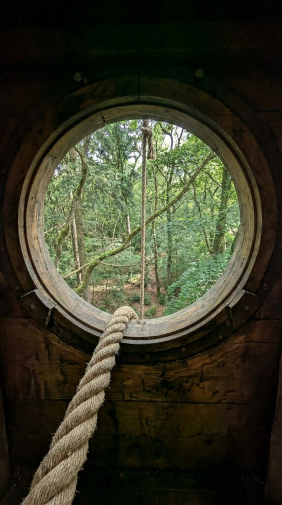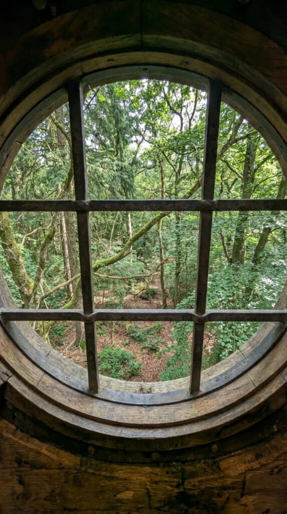 The shelter is equipped with a dedicated emergency escape exit designed for rapid evacuation in critical situations. This exit is implemented as a circular window integrated directly into the tree structure and reinforced with a solid internal frame. From the outside, it is fully concealed and visually indistinguishable from the natural bark and texture of the surrounding trunk.