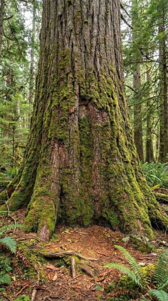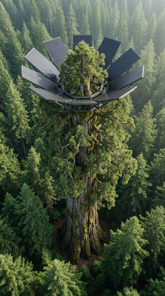 At the heart of a dense evergreen forest rises an ancient giant tree, towering far above the surrounding canopy. This centuries-old tree becomes the foundation for a fully concealed off-grid solar power system, engineered to operate silently and invisibly within the natural environment.