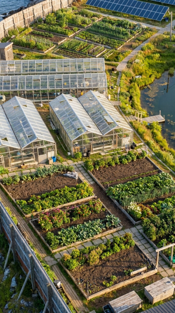 A small freshwater pond nearby supports irrigation and helps regulate the local microclimate. Solar panels positioned close to the gardens power irrigation pumps, lighting, and greenhouse ventilation, making the entire system energy-independent.