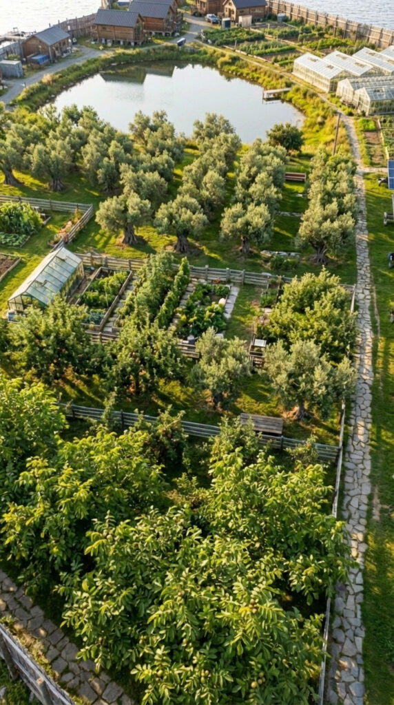 The island features a diverse orchard with fruit trees, nut trees, and olive trees, carefully arranged to maximize sun exposure and natural wind protection. These perennial crops provide a stable source of fruits, oils, and nuts year after year, reducing dependence on imported food.