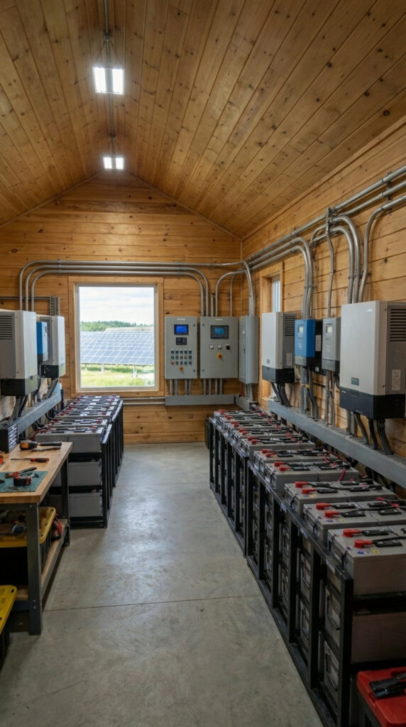 This image shows the island’s main power supply room built inside a compact wooden utility structure. The room contains large-capacity battery banks, inverters, charge controllers, and electrical distribution panels connected directly to the island’s solar array. All wiring is neatly organized and protected, ensuring stable, off-grid electricity for the cabins, greenhouses, security systems, and common areas around the clock.