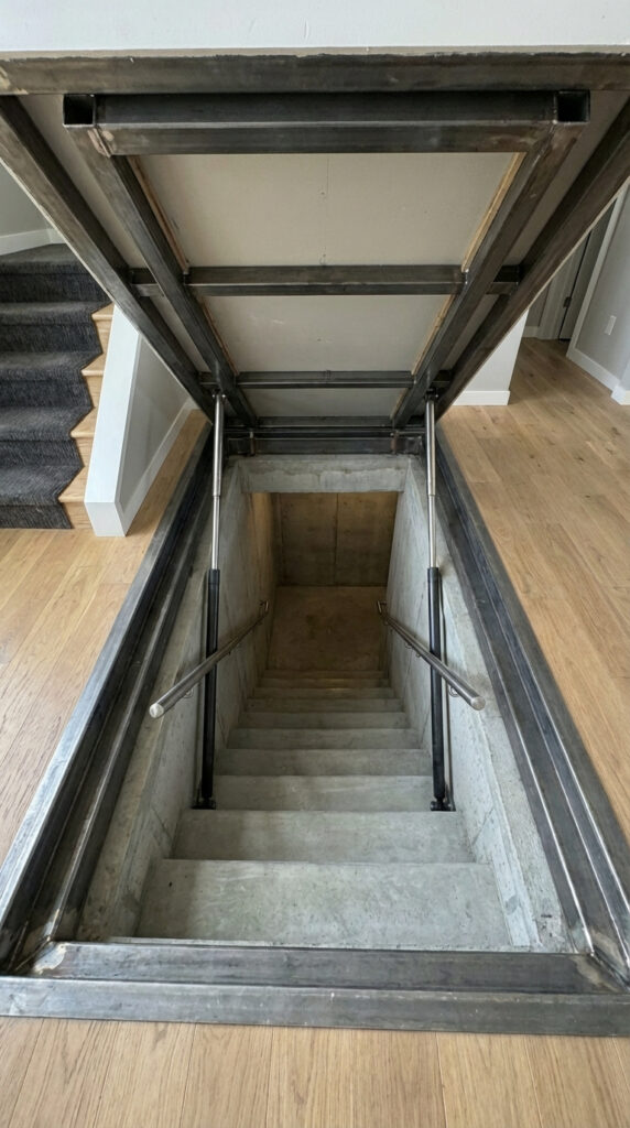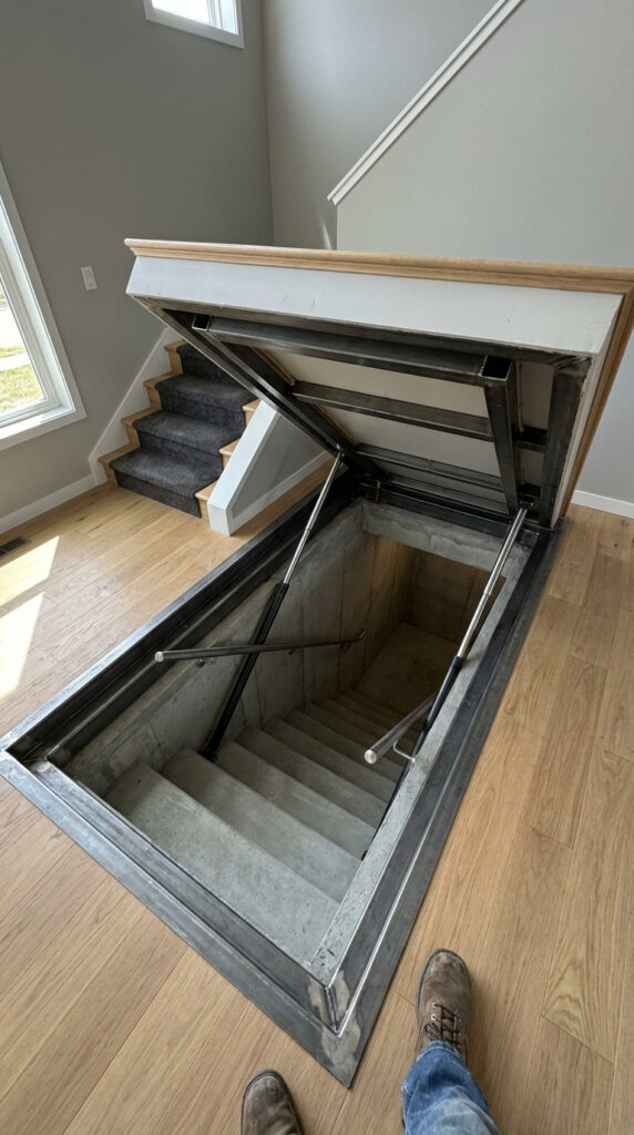 Hidden underground concrete shelter beneath a private home. Reinforced structure, concealed floor hatch, and safe stair access.
