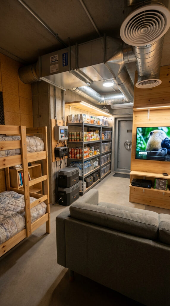 A comfortable sofa and bunk beds provide seating and sleeping accommodations for multiple occupants. Integrated shelving systems store long-term food supplies, bottled water, and essential equipment, ensuring readiness for extended stays underground.