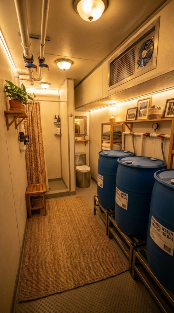 The water system is based on large-capacity potable water storage tanks, securely mounted and connected through reinforced plumbing lines. Pressure regulation and manual shut-off valves allow controlled distribution of water to all bathroom fixtures, ensuring safety and reliability.