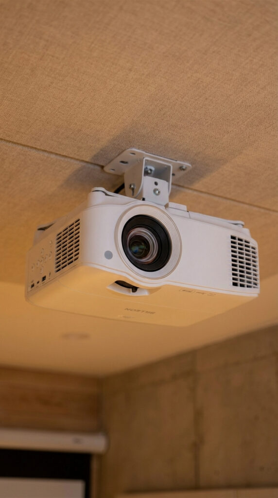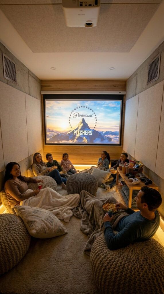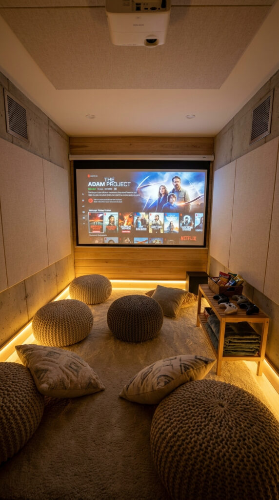 The room is equipped with a ceiling-mounted projector and a large projection screen, creating a cinematic viewing experience for movies, streaming services, and presentations. Acoustic wall panels and soft indirect lighting enhance sound quality and visual comfort while reducing fatigue.