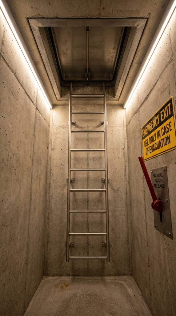 Such an emergency exit is a critical safety feature for modern underground shelters, survival bunkers, and secure residential designs where evacuation flexibility and concealment are essential.