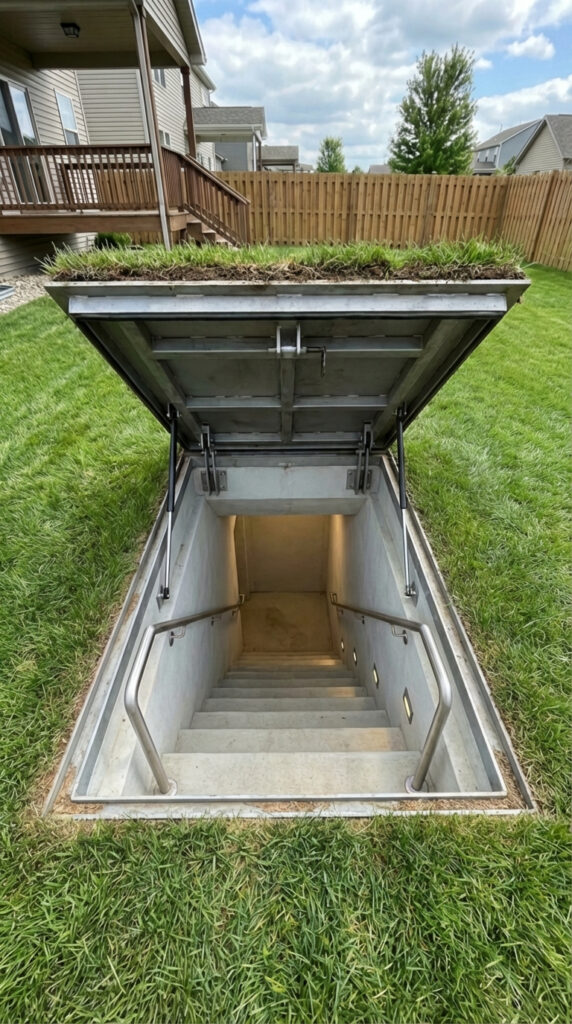 This underground shelter is equipped with a concealed emergency exit designed to provide a safe and discreet evacuation route in critical situations. The exit is hidden beneath a reinforced hatch that blends seamlessly into the surrounding lawn, remaining visually indistinguishable from the landscape above.