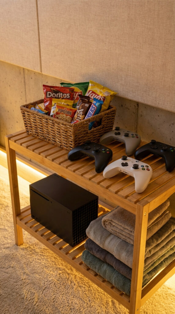 Comfortable floor seating, poufs, cushions, and soft textiles allow flexible seating arrangements for individuals or groups. A dedicated gaming area features modern consoles, multiple controllers, and accessories, supporting entertainment for all ages.