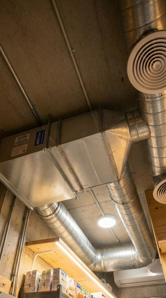Snacks, blankets, and essential accessories are stored within arm’s reach, ensuring convenience during long viewing or gaming sessions. The room is fully integrated with the shelter’s ventilation and air circulation system, maintaining fresh air and temperature stability.