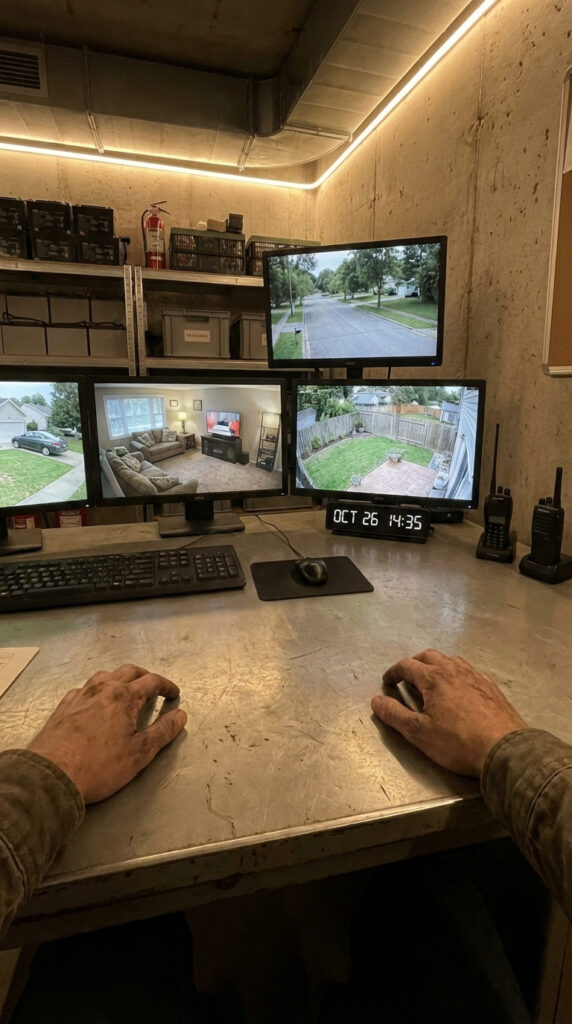 Live video feeds are displayed on a multi-screen setup, allowing simultaneous monitoring of several viewpoints in real time. This configuration enables rapid threat assessment, early detection of unusual activity, and full visual control without exposing occupants to external risks.