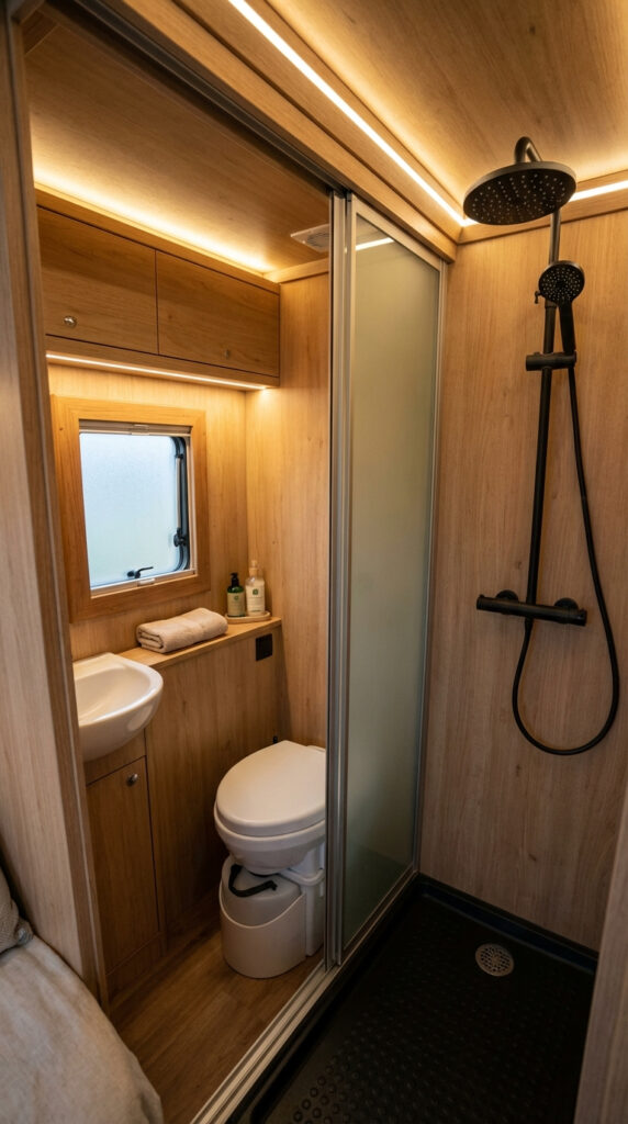 This compact yet fully functional bathroom and storage zone is designed for long-term off-grid living without sacrificing comfort.