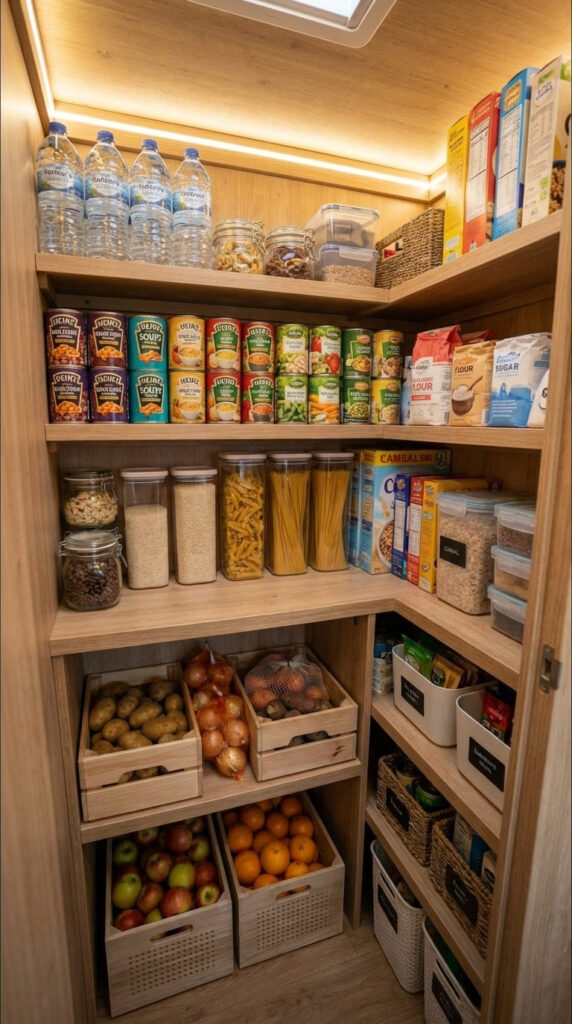 Next to the bathroom is a dedicated supply room, thoughtfully organized for long-term survival: