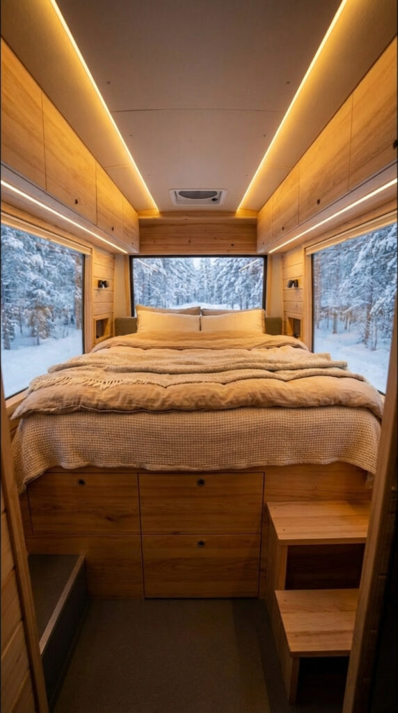 The mattress is designed for extended use, offering full residential comfort rather than typical vehicle sleeping solutions. Natural textiles, layered bedding, and wooden finishes reinforce the feeling of a cozy cabin rather than a mobile unit. Temperature remains stable thanks to proper insulation and integrated heating systems, making the bed comfortable in both extreme cold and mild conditions.