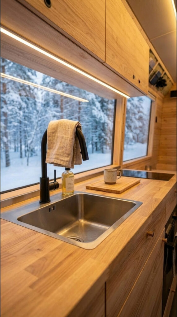 The kitchen is designed as a true off-grid workspace where every detail serves both comfort and practicality. A solid wooden countertop runs along the panoramic window, turning everyday tasks into a visual experience with direct views of snowy forests outside. Natural light fills the space during the day, while warm integrated LED lighting provides soft illumination at night without harsh glare.