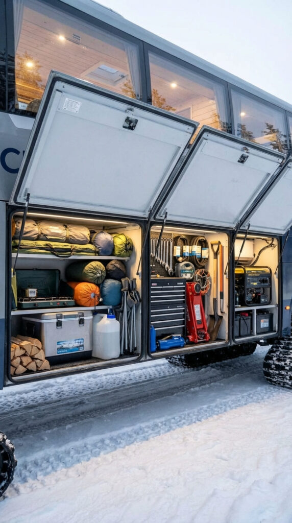 Each compartment is accessed through top-hinged insulated doors, allowing quick and convenient access even in deep snow or harsh environments. The internal layout is carefully organized to accommodate: