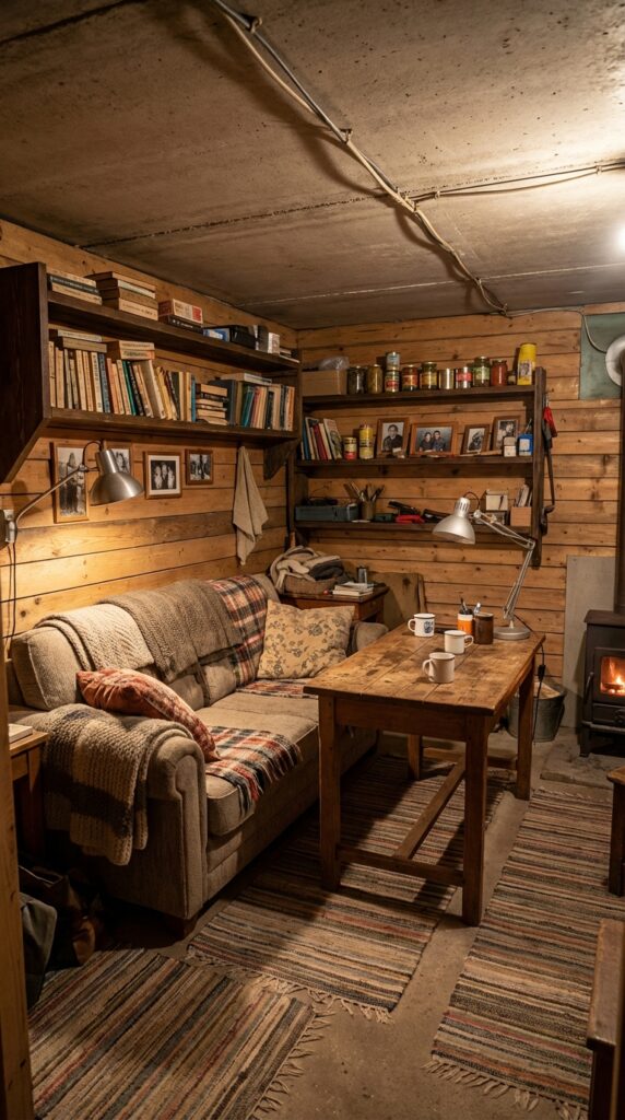 The underground living room transforms the bunker from a survival structure into a livable refuge.