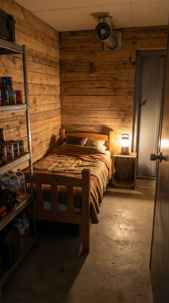 Open shelving along the walls stores essential supplies such as water, canned food, and personal items, keeping everything within reach without cluttering the space. This layout allows the bedroom to function both as a sleeping area and a secure retreat during extended shelter use.