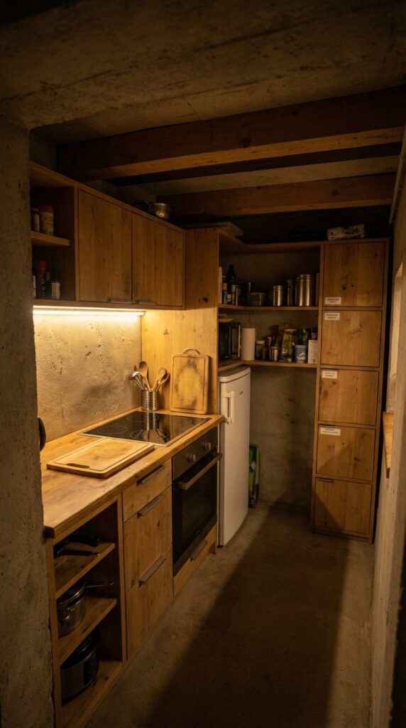 This underground shelter kitchen reflects the philosophy of preparedness: simple, reliable, and built to work when it matters most.