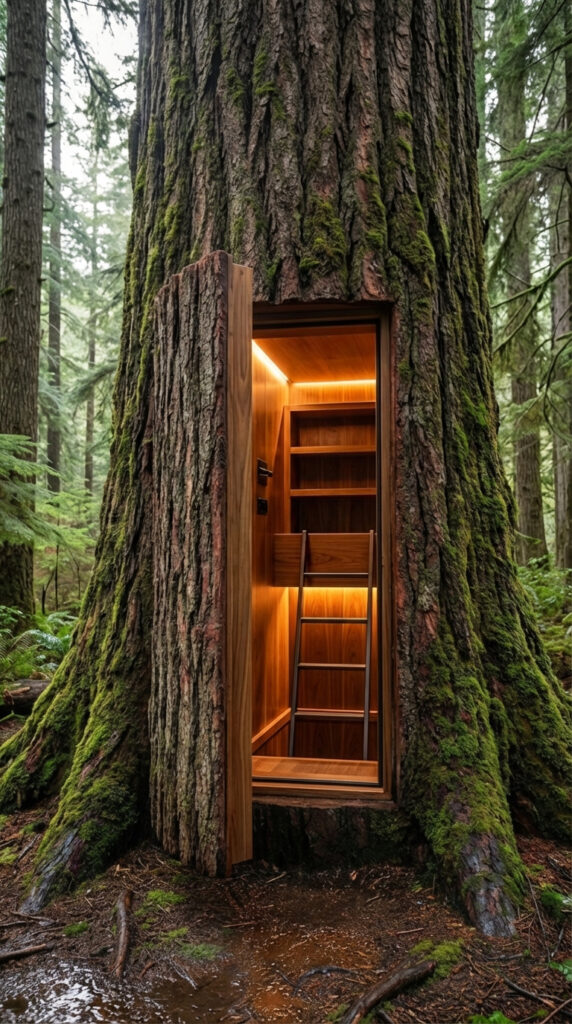 A critical safety element of this design is the separate emergency escape route, which leads from the rear chamber to a vertical ladder concealed inside a massive living tree. This hidden exit opens through a camouflaged wooden door integrated into the tree trunk, allowing silent and discreet evacuation without disturbing the surrounding terrain.