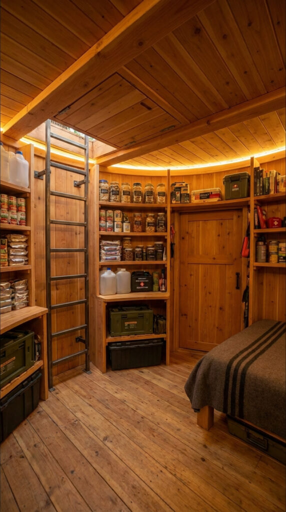 The living zone includes a sleeping area, organized storage shelves for food, water, and essential supplies, and a direct vertical access ladder leading to the concealed entrance above. Solid wooden walls and flooring improve thermal insulation, reduce humidity, and ensure long-term comfort during extended stays underground.