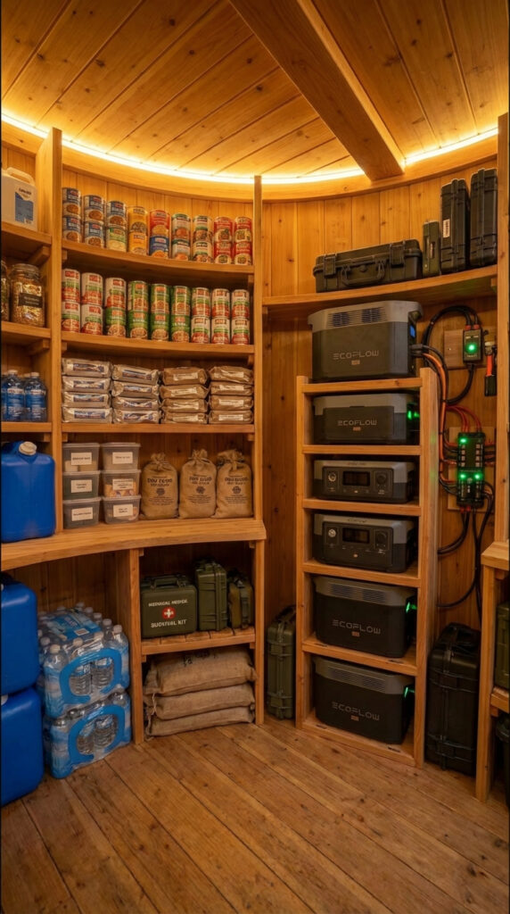 The storage area includes long-term food reserves, sealed dry goods, canned supplies, bottled water, and emergency medical kits, all arranged on solid wooden shelving for easy access and inventory control. This setup is designed to support weeks or months of self-sufficient living without external resupply.