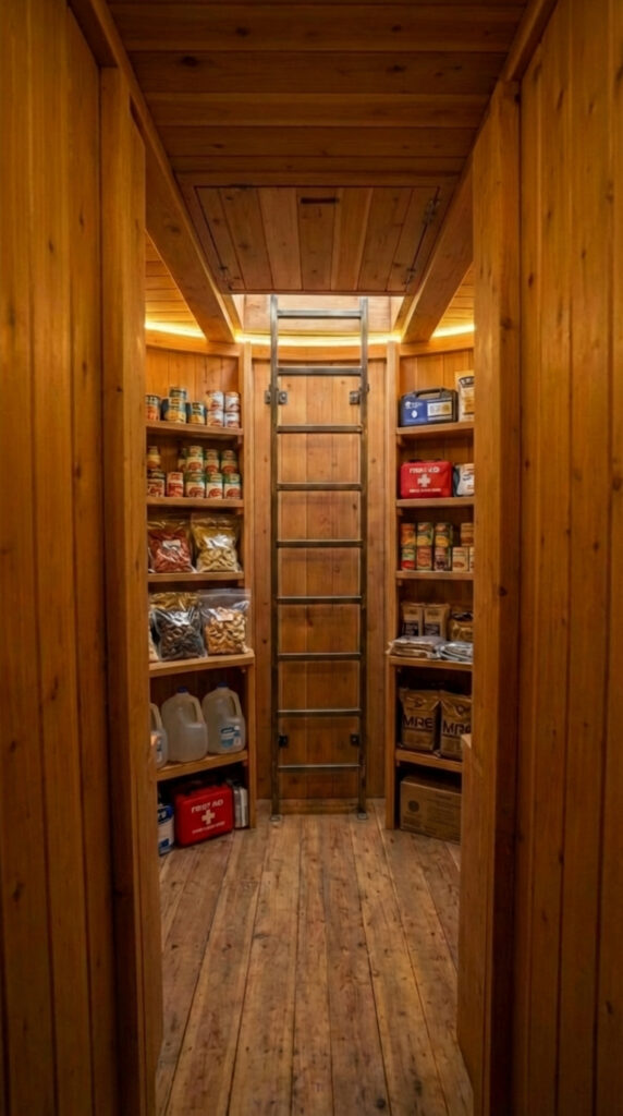 The emergency exit features a reinforced vertical ladder leading to a hidden surface hatch. Solid wooden wall finishes protect the structure while maintaining a warm, residential feel inside the bunker. Shelving along the corridor stores essential emergency supplies, water, food rations, and first-aid kits, ensuring readiness during evacuation scenarios.