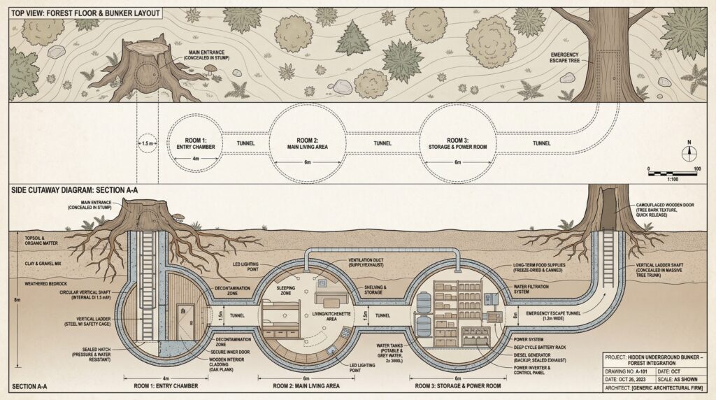 Hidden Tree-Stump Bunker Blueprint – Underground Shelter with Circular Rooms and Forest Escape Exit