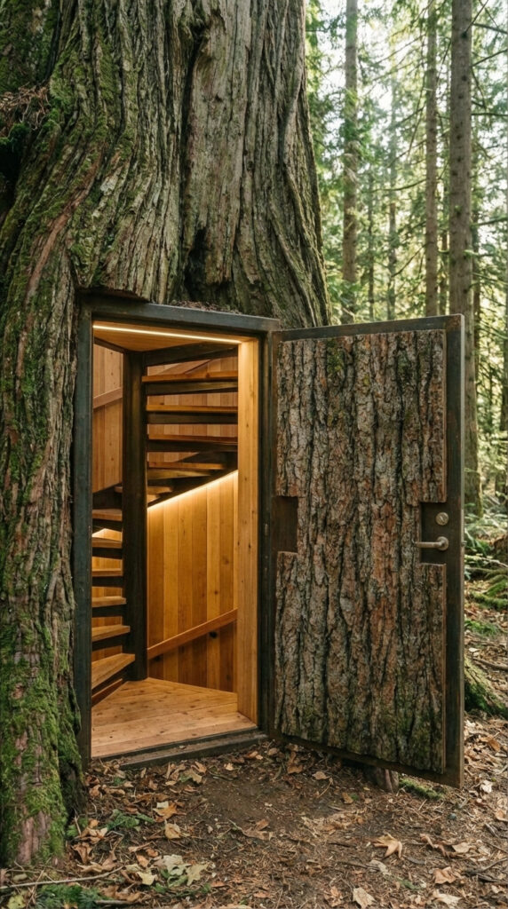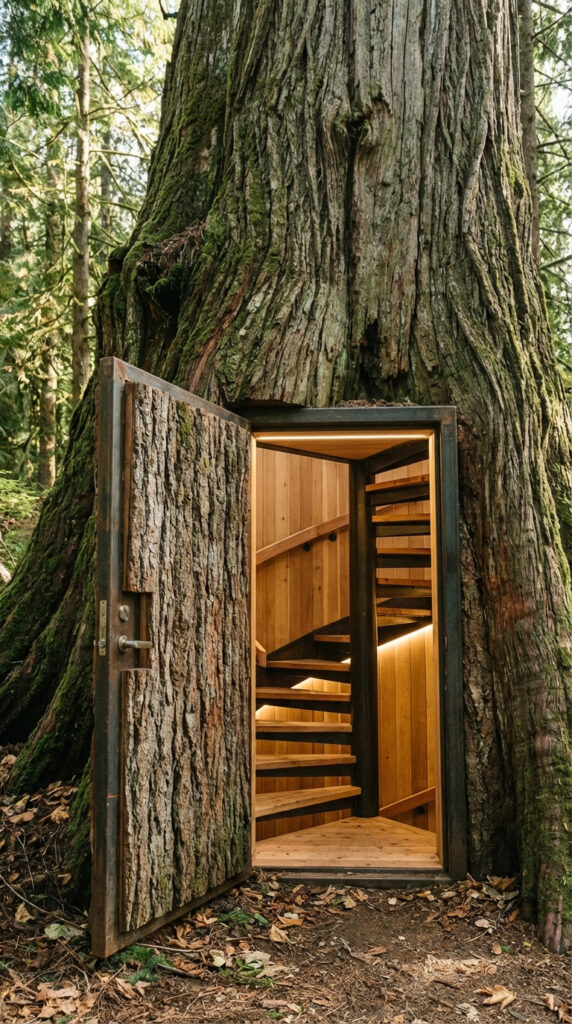 From the outside, it looks like nothing more than an old tree deep in the forest. The entrance is fully hidden, perfectly blended into the bark, and no one would ever notice it unless they knew exactly where to look. The door opens remotely with a discreet control, and the locking system has built-in backup batteries, so it works even if there’s no external power. That detail alone gives me real peace of mind.