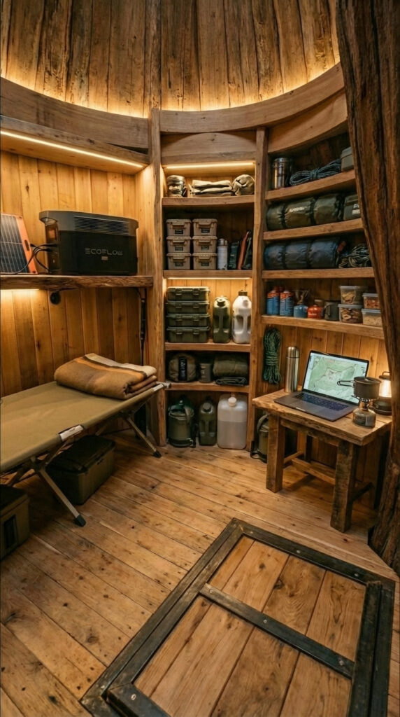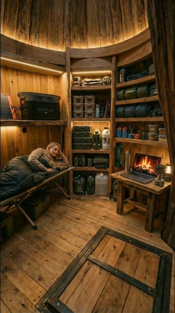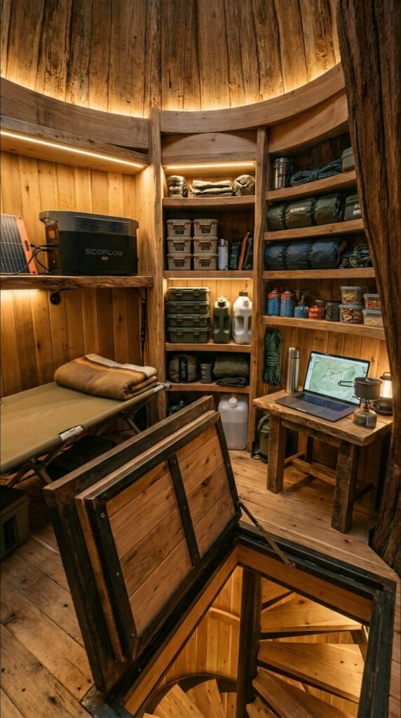 The interior is designed to feel safe, private, and human. No sharp corners, no exposed metal, no clutter. Just a hidden tree shelter interior made for long-term living, with off-grid power, concealed storage, emergency supplies, and a secret underground room that feels more like a quiet forest home than a survival shelter.