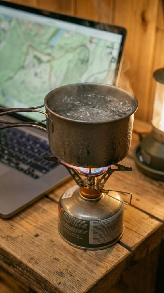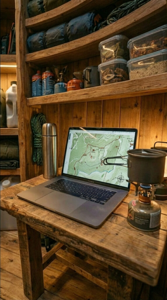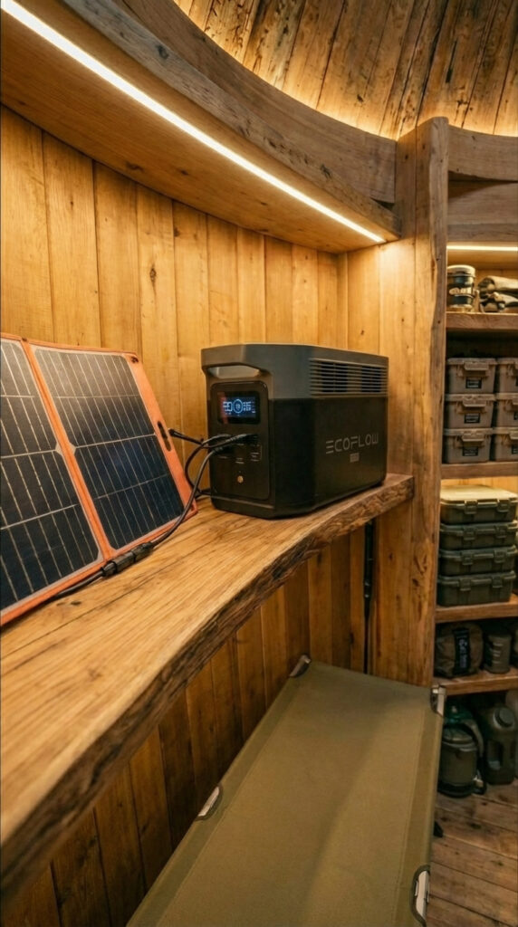 On one side, I keep my small work corner. A simple wooden desk, my laptop open with offline maps and notes, and a compact gas stove for tea or quick meals. Power comes from an EcoFlow battery station mounted on a solid shelf above the sleeping cot. It’s connected to a foldable solar panel outside, so during the day the system quietly charges itself. Even at night, I have enough energy for lighting, the laptop, communication devices, and basic electronics without worrying about running out.