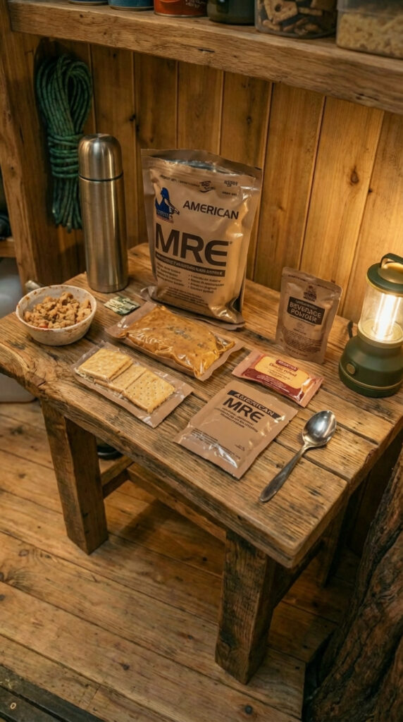 Inside this interior, evenings feel calm and intentional. I take an MRE from the shelves, set a compact gas stove on the wooden table, and within minutes I have a hot meal, no matter the weather or season outside. The gas canisters are stored separately, safely and neatly, and the cookware is minimal, reliable, and made for real autonomy. There is always water nearby, a lantern within reach, and a thermos ready, so cooking never feels like survival, it feels like a quiet routine that brings comfort. Even deep in the forest, dinners here feel grounded and familiar. This shelter was designed for off-grid living, where simple MRE meals, gas burners, and well-organized supplies turn isolation into confidence and independence. hidden bunker interior, survival shelter kitchen, off grid shelter interior, MRE meals survival, gas stove bunker, autonomous forest shelter, prepper bunker living, concealed shelter interior.