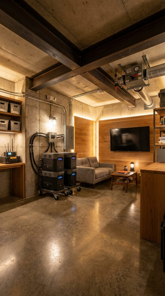 Modern Underground Preparedness Lounge with Power Backup Hub