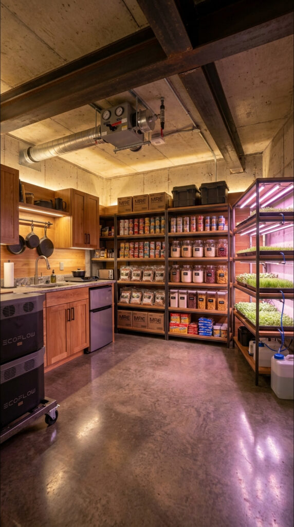 Backup power systems and water storage containers support refrigeration, lighting, and indoor agriculture equipment, ensuring reliable daily operation. The combination of organized food reserves, indoor cultivation, and functional cooking infrastructure creates a dependable supply hub designed for extended underground living and emergency readiness.