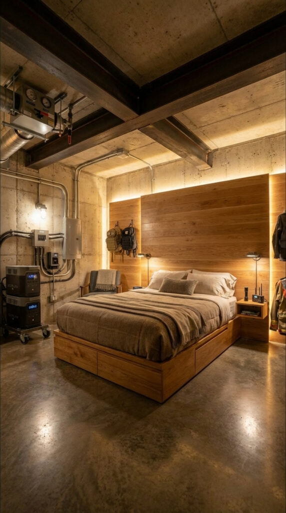 Designed to provide restful living conditions below ground, this reinforced sleeping space blends structural strength with warm residential comfort. The exposed concrete walls and steel support framework deliver long-term durability and protection, while natural wood paneling and ambient lighting create a calm and relaxing atmosphere.