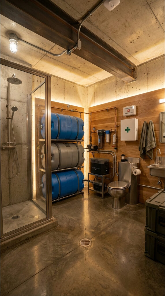 Organized piping infrastructure and accessible control valves allow for easy monitoring and maintenance of water flow and pressure levels. By combining sanitation facilities with emergency water reserves, this underground hygiene room provides essential support for long-term secure living and preparedness-focused environments.