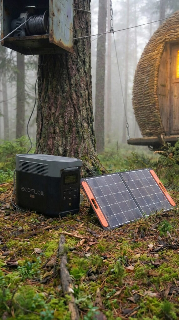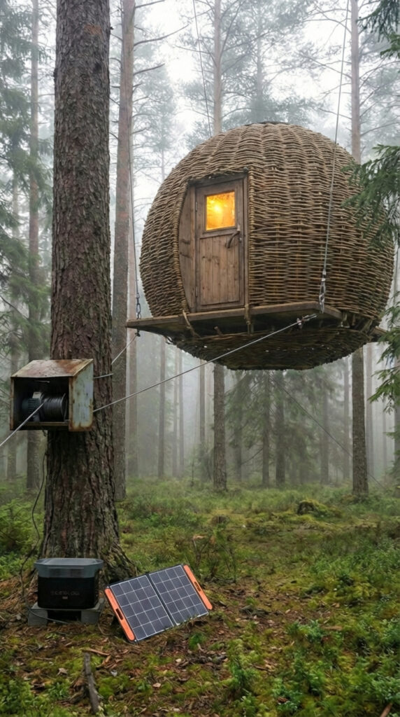 Power for the lifting system is supplied through portable off-grid battery stations, allowing the mechanism to operate independently from traditional electrical infrastructure. These battery units are charged using foldable high-efficiency solar panels positioned in nearby clearings to capture maximum sunlight exposure. The solar charging system provides renewable energy that supports both the lifting mechanism and interior cabin power needs, including lighting, ventilation, and electronic devices.