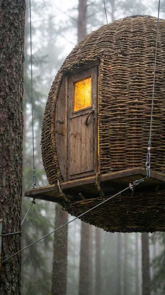 This suspended woven forest pod cabin represents an innovative approach to eco-friendly off-grid housing. By combining traditional handwoven construction techniques with modern lifting and stabilization engineering, the shelter provides a unique elevated wilderness retreat designed for stealth, sustainability, and long-term remote living adaptability.