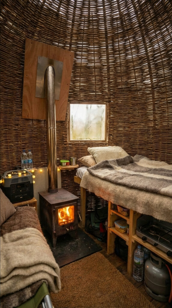 The primary heat source inside the cabin is a compact wood-burning stove installed in the central living area. The stove efficiently distributes heat throughout the spherical interior thanks to the rounded woven wall structure, which naturally helps circulate warm air. The reinforced chimney pipe safely directs smoke outside while maintaining proper ventilation and air quality. This heating system allows residents to maintain comfortable temperatures during cold seasons while also providing the ability to boil water and cook food when needed.