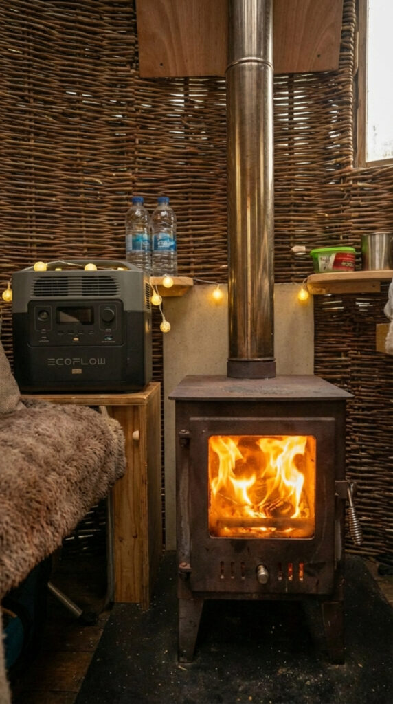 Together, the wood stove heating system and solar-powered battery energy supply create a self-sufficient and reliable living environment. This integrated approach allows the cabin to function independently while maintaining warmth, comfort, and modern off-grid functionality in remote forest conditions.